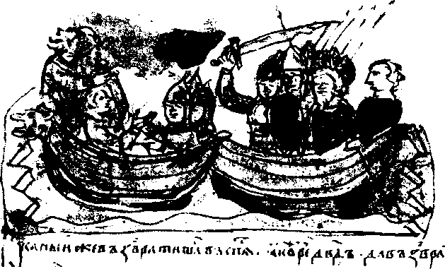 Если бы древлянские послы могли предполагать, чем кончится их миссия, они, наверное, не стали бы следовать этому коварному замыслу Ольги. По существу, она обрекала их на смерть и — еще над живыми — собиралась совершить обряд погребения. Ведь передвижение людей в ладье, носимой на руках, — это знак смерти. Достаточно вспомнить, что обряд захоронения в ладье был широко распространен на скандинавском севере. Знали его и на Руси. Ибн-Фадлан описывает обряд сожжения руса на корабле, случившийся на Волге.