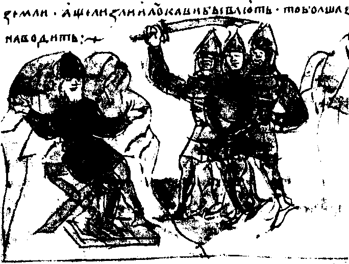 Рис. 36. Отсечение руки и убийство Андрея Боголюбского заговорщиками-боярами при соучастии жены князя