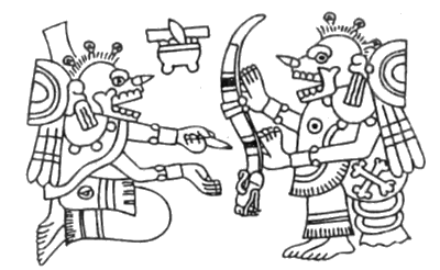 Все боги, как и Ометеотль, обладали способностью трансформироваться в различные ипостаси, давая рождение другим богам или появляясь в качестве эманаций самих себя. Например, Кецалькоатль был также известен как Тлауискальпантекутли, бог льда, который представлял утреннюю Венеру. Он был ослеплен стрелой, вылетевшей из солнца, и поэтому носил на глазах повязку. Его называли Кривой Нож из-за ледяных кристаллов или ледяных кинжалов, которые он олицетворял. Венера была известна одновременно как Утренняя и как Вечерняя звезда, поскольку порою она восходит рано утром, чуть раньше солнца, а в другое время ее можно увидеть только вечером, после того как солнце село на западе. Как Вечерняя звезда, Кецалькоатль становился Шолотлем, псом, который, как гласит предание, однажды плакал так долго, что его глаза выпали из глазниц, и он, подобно Кривому Ножу, стал слепым. Но это было совсем неплохо, поскольку такое обличье позволило Кецалькоатлю спуститься в подземный мир и украсть кости, из которых были сделаны люди эпохи Пятого Солнца, эпохи Ягуара. Только Шолотль мог сделать это, так как его слепота помогала ему видеть во мраке Миктлана, где были надежно укрыты кости мертвых. Ицпапалотльтотек и Ицпапалотльтотекуатль были супружеской парой богов-бабочек, олицетворявших жертвоприношение. Однажды они собирали цветы в райском саду Омейокана, когда по неосторожности сломали ветку дерева, из которого хлынула кровь. Другие боги разгневались на них и обрушили им на головы обсидиановый дождь. Так они стали обсидиановыми бабочками, которые впали в немилость и были изгнаны с неба. Эти два божества ассоциировались с исчезновением с небосвода двух звезд, и, следовательно, их можно связать с двойной звездой Венерой. Все боги могли менять свое обличье, но волшебница Килатцли, «зеленая цапля», владела этим искусством лучше всех. Она перевоплощалась в самых различных животных и поэтому имела множество имен, среди которых женщина-змея, женщина-орел, и женщина-воин. Согласно легенде, она сопровождала людей миштеков, когда те мигрировали в долину Мехико. Она сидела на кактусе в облике красного орла, когда к ней приблизились два воина. Они вознамерились убить орла, но тут она превратилась в точное подобие их сестры. Увидев свою сестру, они сразу же передумали ее убивать.