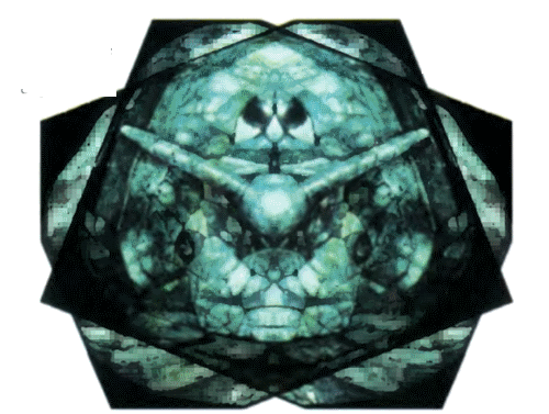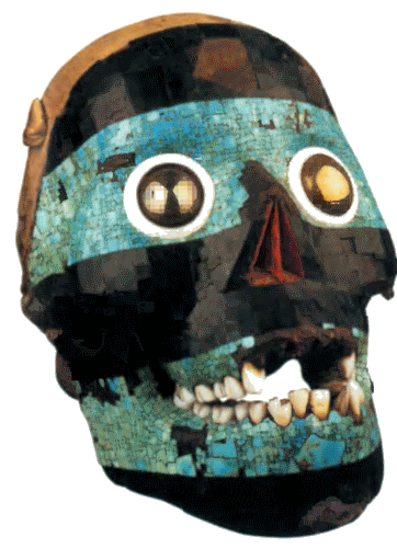 Вкладка 6. Миштекская маска, инкрустированная бирюзой и нефритом. Ее характерными особенностями являются рог, закрытый маской летучей мыши, и высокая прическа Кецалькоатля, такая же, какой она изображена в Сцене 4 «Физическая смерть Властелина Пакаля» дешифрированной крышки из Паленке.