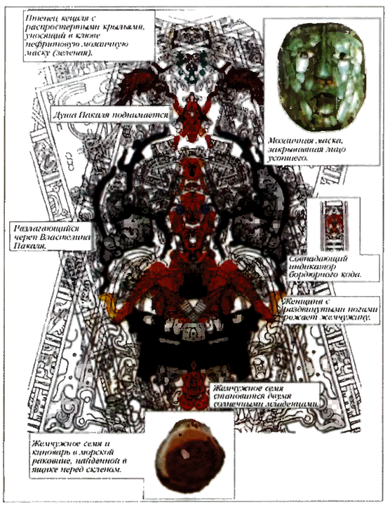В нижней части иллюстрации показан фрагмент надгробной плиты повелителя майя, которая, используя иконографический символизм, среди многих прочих вещей рассказывает нам ту же самую историю.