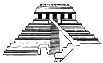 Вкладка 1. Храм Надписей в Паленке расположен па вершине девятиуровневой пирамиды. Центральная лестница разбита на пять маршей, по 9, 19, 19, 13 и 9 ступенек каждый (всего 69). На степах храма вырезано620 надписей, которые и дали ему название, храм имеет 5 дверных проемов и 6 колонн, поддерживающих крышу.