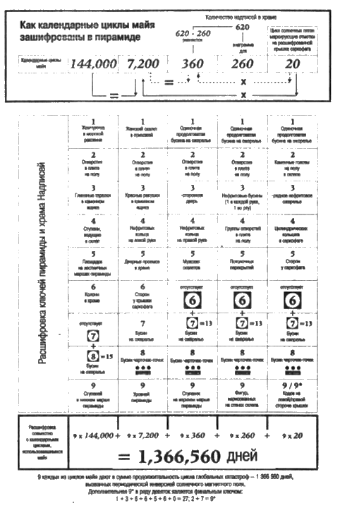это даст нам число 1 366 560, период катастроф, или то, что для майя было датой рождения Венеры. Отсюда становится очевидным, что, согласно замыслу майя, истинный смысл их циклов может раскрыть только тот человек, который понимает научную важность числа 260, поскольку именно астрономическое значение чисел 260 и 1 366 560 составляет основную суть их послания. Что касается поклонения числу 9, то скоро мы увидим, как они разработали невероятно остроумную систему ключей, которая использовалась при кодировании информации в храме Надписей в Паленке. Эта система позволила им продублировать одно и то же послание, скрыв его в своей архитектуре, а также резных изображениях и ювелирных украшениях. Те, кого заинтересовали числа майя, могут обратиться к разделу с тем же названием в книге «Пророчества майя». Там я показал, что их система счисления имеет еще несколько уровней, которые свидетельствуют о том, что майя знали десятичную систему, но сознательно не использовали ее в своих надписях.