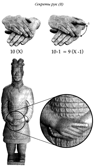 Археологи были удивлены тем обстоятельством, что форма лиц (вместе с формой головы и прической) 8 тысяч солдат соответствовали всего лишь десяти формам из китайского алфавита, насчитывающего в общей сложности 10 516 иероглифов: (рю, цзя, шэнь, ё, юнь, чжи, му, фэн, тянь, го). Как ни странно, хотя в официальных записях о раскопках в Сиане даны названия иероглифов, археологи не позаботились объяснить их смысл. Возможно, им не пришло в голову поинтересоваться, что обозначает каждый иероглиф, или же они знали, но предпочли не говорить. Так или иначе, они поспешно перезахоронили вырытых солдат и замаскировали места пробных раскопок. В течение почти двух лет место находки находилось под строгой охраной, а затем раскопки неожиданно возобновились. Никаких объяснений от властей не последовало, и до сих пор в официальном археологическом путеводителе ничего не сказано о смысловом значении этих десяти иероглифов. Трудно понять причину такой секретности; в конце концов китайско-английские словари продаются во всех западных странах. Одним из наиболее известных является «Китайско-английский словарь современного словоупотребления», составленный Лин Ю-таном. Иероглиф шэнь (обезьяна) является девятым знаком китайского астрологического зодиака, основанного на двенадцатилетнем цикле. В своих книгах я объяснял, что число 9 является высшим числом, которого можно достичь перед соединением с Богом (10), поэтому древние цивилизации, в которых существовал культ Солнца, пользовались девяткой для обозначения божества, а числом 999—для обозначения «сверхбога», или духовного учителя (999 противоположно 666, или числу зверя, в евангельском Откровении св. Иоанна).