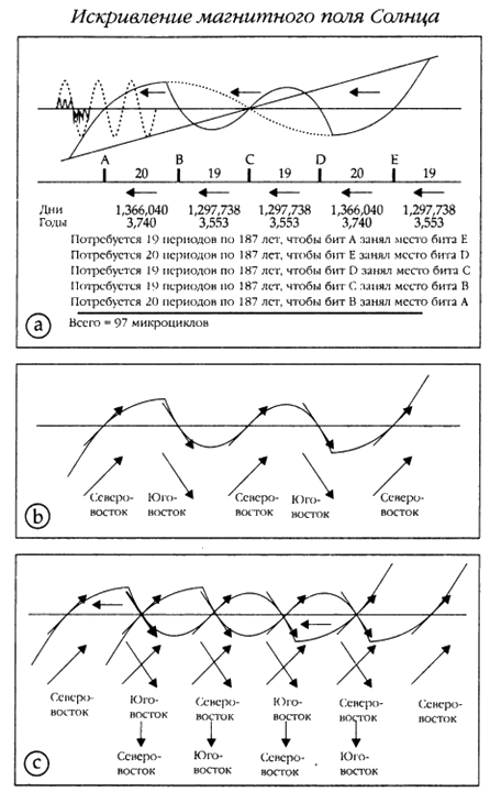 В 30-х годах прошлого века американский бизнесмен и энтузиаст-исследователь Джеймс Черчвард поддержал теорию ле Плонжона, но в то же время представил собственные убедительные доказательства существования исчезнувшего континента Му. Это были зарисовки, сделанные им с древних каменных табличек (рис. А57а), на которые он наткнулся в одном монастыре в Брахмапутре (Тибет), когда находился там в качестве тайного агента британской армии. Эти таблички были названы в честь легендарных адептов майя — наакалей («возвышенных»), которые путешествовали по всему миру, обучая своей науке, инженерному искусству и языку. Черчвард также полагал, что обитатели континента Му использовали технологии, намного превосходящие современные, в том числе антигравитацию, которая позволяла им перемещать огромные объекты и сооружать колоссальные постройки. Он утверждал, что их цивилизацию ни в коем случае нельзя считать примитивной, а их понимание космических сил и «энергий» было просто выдающимся. Он был уверен в том, что высшее знание, которое позволяло строить пирамиды, как в Египте, так и в Мексике, пришло из Атлантиды, а до этого с континента Му, примерно 25 тысяч лет назад. Черчвард не сомневался в том, что таблички наакалей содержат фрагменты глубоких знаний, контуры которых лишь сегодня проступают на горизонте современного научного мира. Он показал, что на табличках описан механизм катастрофического погружения континента Му, который состоит в следующем: повышение уровня солнечной радиации привело к перегреву земного массива, что вызвало расширение подземных газов, которые начали вырываться на поверхность. Суша просела и скрылась под водами Тихого океана вместе с 64 миллионами ее обитателей. Но какое отношение все это имеет к пернатому змею? Черчвард скрупулезно перерисовал рассказ о потопе с табличек наакалей: на одной из них (рис. А57а) изображен солнечный диск с маленькой фшуркой, похожей на силуэт пернатого змея в районе экватора (рис. А57а, 1b). Если табличка ведет свое происхождение с континента Му, то ей должно быть около 25 тысяч лет. Часто даже самые мелкие детали оказывают решающее воздействие на ход расследования. Так произошло и с зарисовками Черчварда. По всей видимости, обитатели Му были хорошо знакомы с наукой о Солнце и так же, как и майя, знали о существовании искривления на нейтральной плоскости солнечного магнитного поля (рис. А17—19). Они знали, что, когда 11,5-летний солнечный цикл налагается на искривление нейтральной плоскости, общий вид графика имеет форму оперенного змея (рис, А57b). Это имело столь важное значение, что они вырезали соответствующий рисунок на одной из своих бесценных табличек — пернатого змея на фоне солнечного диска. Становится ясно, что легенда о пернатом змее в действительности повествует о том, как Солнце воздействует на Землю. Пернатый змей был Солнцем. Египтяне чтили оперенного змея в своих монументах и изображениях (рис. А57с). Тутанхамон носил знак школы посвященных «Оперенного Змея» на лбу и на бороде (рис. А58). В Мексике правитель Пакаль был известен своим подданным под именем «Оперенного Змея». Виракоча Пачакамак из Перу зашифровал такое же сообщение в иероглифическую резьбу Врат Солнца (рис. А59), которые стоят перед храмом Каласасайя, и, как я объяснил в книге «Белые боги инков», он же оставил загадочные сообщ