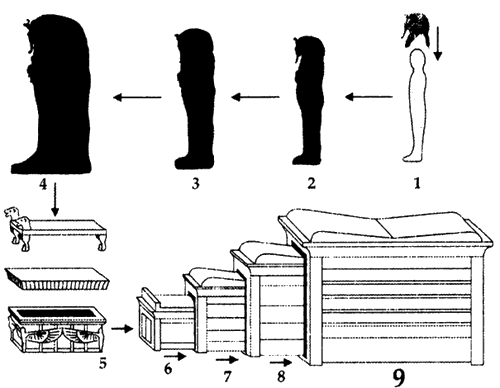 Рис. А38. Мумия Тутанхамона была заключена в 9 гробов. Символизм девятки заключается в том, что это наибольшее число, которого можно достигнуть, прежде чем стать единым (1) с Богом (0), как в числе 10. Тутанхамон, как и другие «солнечные владыки», был вторым только по отношению к Богу.