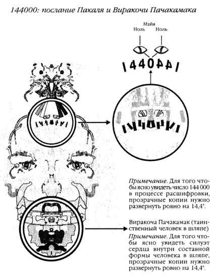 Рис. А52. Согласно Библии те, у кого на лбу запечатлено число 144 000, принадлежат к числу немногих избранных, которые войдут в Царствие Небесное. На лбу правителя Пакаля начертано число 144 000 (в кружке наверху). Символическое изображение сердца внутри составной фигурки таинственного человека в шляпе (в кружке внизу) можно завершить лишь в том случае, если перевернуть прозрачные копии, совместить их и повернуть под углом 14,4°. Вместе эти послания говорят нам, что лишь чистые сердцем могут войти в число 144 000 избранных вместе с Пакалем и Виракочей.