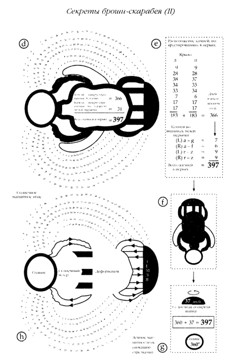 (f) и(g) Солнечный диск и полумесяц, по-видимому, содержат еще один слой информации; солнечный диск, состоящий из 360°, и полумесяц (представляющий полярную шапку Солнца, которой требуется 37 дней для одного поворота) вместе дают 397. Это позволяет сделать еще один шаг в интерпретации символического значения броши.