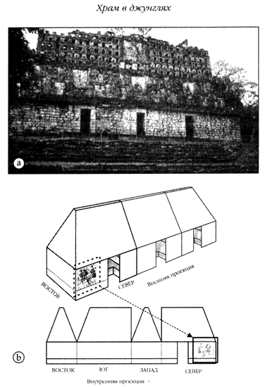 Рис. А61. (а) Таинственный храм в джунглях, открытый Карлосом Фреем в 1946 году. (b) Все стены и потолки храма покрыты загадочными фресками (участок, обведенный рамкой, обсуждается в этой главе).