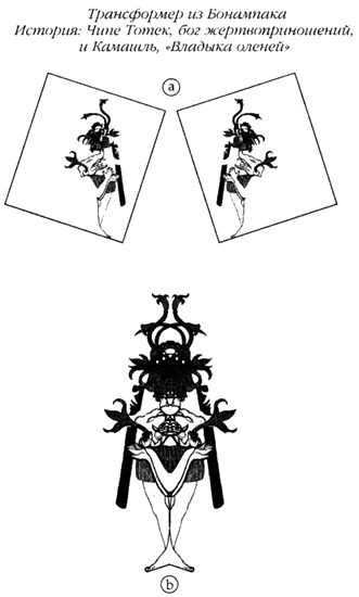 Вкладка 3. (а) Расшифрованная составная картинка с мозаичной маски из Паленке, изображающей правителя Пакаля в виде Оперенного Змея Кецалькоатля. Чтобы увидеть эту составную картинку, необходимо совместить два одинаковых диапозитива, повернутых под углом 66,6 градуса. (b) Расшифрованная составная картинка с фрески в Бонампаке (см. также Приложение 46 iv), изображающая Чипе Тотека, майянского бога огня, жертвоприношений, возрождения и плодородия, в его ипостаси Камаштля, повелителя оленей. Камаштль держит в руках палочки для добывания огня. В этой финальной сцене он совершает поклон перед двумя оленями, которые аплодируют в конце представления. Чтобы увидеть эту составную картинку, необходимо совместить два одинаковых диапозитива, повернутых под углом 33,3 градуса.