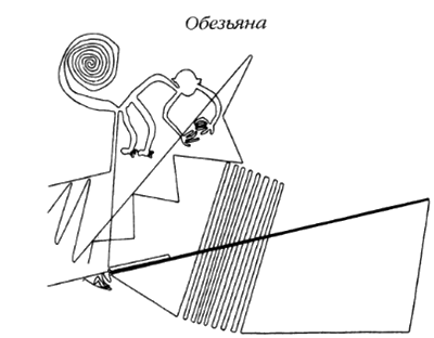 Рис. А67. Огромный рисунок обезьяны в песках пустыни Наска (Перу). Обезьяна имеет четыре пальца на правой руке и пять на левой; один палец отсутствует точно так же, как на барельефе Виракочи в Тиауанако (рис. А59). Она обнимает самую большую из трех идентичных фигур (треугольник).