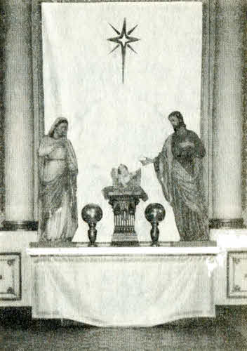 Рис. А70. У алтаря собора в Гвадалахаре (Мексика) новорожденный младенец Иисус изображен под двойной звездой, вместе с Марией и Иосифом. Серебряные сферы на подставках по обе стороны от Иисуса символизируют Венеру в ее аспектах утренней и вечерней звезды.