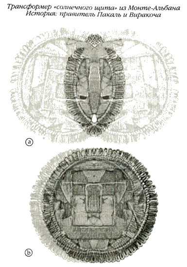 Рис. А77. (а) Составное изображение правителя Пакаля (белого человека с бородой), выплевывающего жемчужину, заключенное в vesicapisces (рыбовидный символ христианства, образованный пересечением двух перекрывающихся окружностей). (b) Из Монте-Альбана в Мексике (числовой анализ см. на рис. A57d). Составное изображение Виракочи. Эти расшифрованные картинки выявляют новые соответствия между зубчатым спинным гребнем у статуэтки белого человека с бородой из Анканя и зубчатым узором на «солнечном щите».