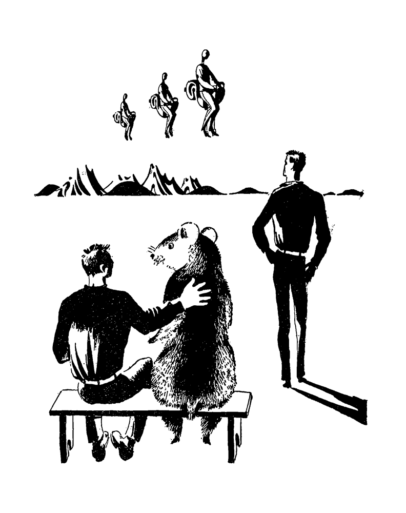 Гигантский диск Солнца яростно пылал в небе Венеры. Теперь оно очистилось от тумана; исчезли облака, ранее скрывавшие планету. Какая-то сила, изменив радиацию Солнца, обрекла на гибель одну цивилизацию и дала жизнь другой. Менее пяти тысяч лет назад полудикое население Венеры впервые увидело Солнце и звезды. Земная наука начинала с астрономии — то же самое произошло и на Венере. В этом теплом и богатом мире, которого Человек никогда не видел, развитие пошло невероятно быстро. Может быть, венерианам повезло: они не знали средневековья, которое на тысячу лет сковало Человека. Жители Венеры избежали долгого, окольного пути изучения химии и механики и сразу открыли основные законы физики излучений. За то время, которое потребовалось Человеку, чтобы шагнуть от пирамид к ракетному космическому кораблю, венериане проделали путь от освоения земледелия до открытия антигравитации — тайны, так и не постигнутой Человеком. Теплый океан, который все еще нес в себе большую часть органической жизни молодой планеты, лениво катил буруны на песчаный берег. Этот материк был таким юным, что даже песок его был грубым, крупнозернистым. Море еще не успело растереть его и сделать гладким. Ученые лежали наполовину в воде. Их великолепные тела рептилий поблескивали на солнце. Величайшие умы Венеры собрались на этом берегу со всех островов планеты. Они еще не знали, что нового услышат о Третьей планете и таинственной породе живых существ, населявших ее до прихода льдов. Историк стоял на берегу: приборы, которыми он собирался воспользоваться, боялись воды. Рядом высилась большая машина, привлекавшая к себе любопытные взгляды его коллег — очевидно, какое-то оптическое устройство, судя по системе линз, которая была направлена на экран из белого материала, расположенный неподалеку. Историк заговорил. Он кратко изложил то немногое, что стало известно о Третьей планете и ее обитателях. Упомянул о веках бесплодных изысканий, в процессе которых так и не смогли объяснить ни одного понятия, заключенного в памятниках Земли. Видимо, планету населяли существа, чрезвычайно одаренные в области техники. Об этом можно было судить по немногим деталям машин, найденным в склепе на горе. — Мы не знаем, почему такая развитая цивилизация погибла. Судя по всему, эти существа обладали достаточными знаниями, чтобы пережить ледниковый период. Должно быть, существует другое объяснение, о котором мы ничего не знаем, — болезнь или постепенное вырождение. У нас высказывали мысль, что племенные распри, не прекращавшиеся на Венере в доисторические времена, могли продолжаться на Третьей планете и в эпоху развития технических знаний. Некоторые философы даже утверждают, что само по себе знакомство с машинами еще не говорит о высокой ступени цивилизации и что теоретически войны возможны даже в обществе, располагающем развитой энергетикой, авиацией и радиосвязью. Такая концепция совершенно чужда нашим представлениям, но мы должны допустить, что это могло произойти, что можно и так объяснить деградацию исчезнувшего населения. Многие считают, что мы никогда не узнаем, каков был внешний вид жителей Третьей планеты. Веками наши художники изображали сцены из истории мертвого ныне мира, населяя его всевозможными фантастическими существами, как правило, более или менее похожими на нас, хо
