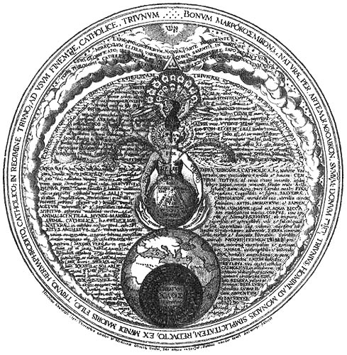 Генрих Купрат, «Амфитеатр вечной мудрости». Сизигия или союз макрокосмического единства с микрокосмическим триединством. Здесь в символической форме изображён весь процесс получения философского камня. Оно в точности повторяет сотворение мира, появление людей, мужчины и женщины, и печальную историю их грехопадения. Примером служит великолепный и совершенный Брак, тайный плод которого уподобляется Божественному Логосу, спасителю человечества, зачатому Святым Духом и Благословенной девой. Как и Христос, божественный камень проходит через распятие, спускается в ад, воскресает и торжественно возносится в небеса в новом, преображённом теле.