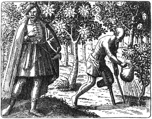 Михаэль Майер. Symbola aureae mensae. На эмблеме Сатурн поливает землю, из которой вырастают солнца и луны. Чтобы умножить и улучшить Материю мудрецов, превращённую сначала в белую серу (лунное дерево), а затем в красную (солнечное дерево), нужно постепенно, капля за каплей, увлажнять её. Сатурн присутствует в образе садовника, как указание на происхождение ртутной воды.