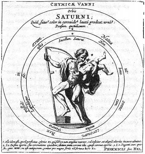 Иоганн де Монте-Снайдер (?), «Chymica vannus». Сатурн или Кронос на этой эмблеме также изображён оскоплённым, как его отец Уран. Сатурн пожирал своих новорождённых детей, поскольку ему предсказали, что один из сыновей свергнет его с престола. Однако матери удалось спасти последнего из детей, Юпитера, подложив вместо него камень. Сатурн означает Ночь, Черноту Разложения; также эту стадию называют головой ворона (Caput Corvi). Но именно эта «голова» главенствует над Работой, поскольку без разложения не может быть созидания.