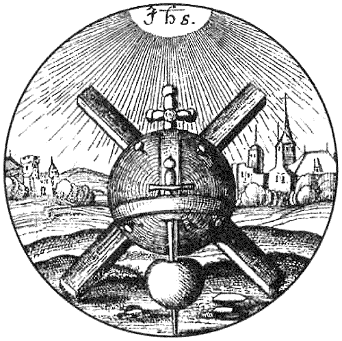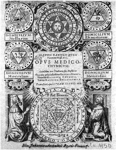 Иоганн Даниэль Милиус, «Opus medico-chymicum». Глиф Милиуса, с двух сторон которого преклонили колени Гермес и Гиппократ, состоит из троичных и четверичных соответствий, а в центре его находится Земля Адама. Четыре эмблемы представляют основные элементы. Огонь (Саламандра) — это звёздный дом: «Что наверху, то и внизу». Воздух (Феникс и Жаба) — дом элементов: «Превращением элементов и тройным очищением получи Одно». Вода (Русалка) — дом минералов: «Все природные вещи в Солнце и Соли». Земля (Лев и Дракон) — дом микрокосма: «Раздели их и доведи их до зрелости».