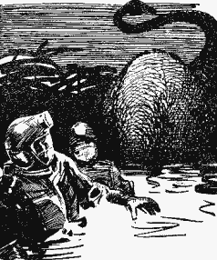 На двенадцатый день Варгаш и Горин, находясь в очередном патрульном облете, заметили среди зарослей рыжую гору с крутым, изрытым склоном, Она напоминала помятую шляпу, изъеденную с одного края молью. Приглядевшись, патрульные обнаружили, что здесь склон горы усеивают отверстия пещер. Они осторожно сели у подошвы. Лишь крылатые лягушки, похожие на огромных кузнечиков, прыгали вокруг, развертывая свои радужные перепонки. — Заглянем в пещеру? — предложил Варгаш. Горин кивнул. Они выбрали самую большую. — Пещера вырыта, — сказал Варгаш. — Видите? На стене в мягком грунте виднелись следы пальцев. В нескольких местах стены были обложены большими необработанными камнями. Варгаш, работавший на Земле в Службе биологической защиты, по привычке следопыта оглядел пол. На глине сохранились отпечатки ног. Ступни широкие, с растопыренными веером пальцами. На одном из следов ясно запечатлелась перепонка, соединяющая пальцы. Патрульные заглянули еще в несколько пещер. Все оказались пустыми. — Где же обитатели? Варгаш показал на истоптанный берег. — Они ушли водой. Значит, не оставили и следов.