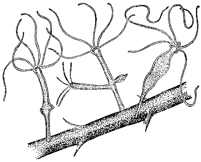 Изучение этого типа имеет большое познавательное мировоззренческое значение. На примере представителей кишечнополостных учащиеся видят эволюционное становление и дальнейшее совершенствование животного мира. Кишечнополостные — это многоклеточные животные. Они обладают некоторыми специализированными клетками, выполняющими разные функции, но простота их организации (наличие только двух слоев клеток, многие ткани находятся только в зачаточном состоянии, диффузность нервных клеток, отсутствие органов) указывает на принадлежность их к низшим многоклеточным животным. В любительском аквариуме гидры — нежелательные гости; в школьном — один из интереснейших объектов для наблюдений и экспериментов. Появляются они в аквариумах случайно с кормами, прудовыми растениями (рис. 15). Выловленные из природных водоемов, гидры хорошо живут в любых сосудах с чистой водой и растениями. Их собирают в конце лета — начале осени с растений (злодея, листья кувшинок, рдест и др.). Здесь же набирают в банки воду и дают ей отстояться на твердом грунте. Если в банку с растениями попали гидры, то через 20–30 мин они расправят тела и щупальца и станут хорошо заметны через лупу или даже невооруженным глазом. Если гидр не окажется в банках, нужно собрать растения в другом месте.