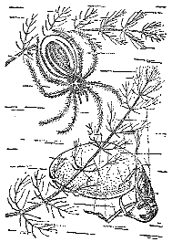 Паук-серебрянка. Научное название паука — серебрянка водяная. Этот единственный вид водяного паука повсеместно встречается в водоемах со стоячей и слабо текущей водой. Он легко адаптируется в аквариумах и интересен как обитатель школьного уголка живой природы. Содержать этого паука можно в любых сосудах емкостью от 1 л (для молодых пауков) до крупных аквариумов, где помещаются несколько разнополых взрослых. К обязательным условиям содержания относятся наличие в аквариуме густого переплетения стеблей водных растений и достаточно обильное кормление — пауки предпочитают водяных рачков (ослики и бокоплавы), но можно их кормить мотылем, бросать на поверхность полуживых мух и других насекомых. И еще одно условие — плотно закрывать аквариум, так как пауки часто выходят из воды и отправляются в путешествие посуху: очевидно, в природе они заселяют новые водоемы. Если пауков расселить заранее по небольшим баночкам с водной растительностью, можно получить к уроку достаточное количество раздаточного материала. Желательно для этой цели использовать взрослых особей: их легче разглядывать (рис. 21).