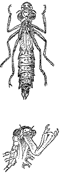 При отлавливании личинок стрекоз нередко вытаскивают на берег водную растительность. Личинки иногда сразу, а иногда спустя некоторое время начинают интенсивно двигаться и легко заметны. Извлекая из мелководья слой тины, можно в нем найти донные формы личинок. Наконец, их ловят, проводя водным сачком по зарослям водных растений. Личинки стрекоз делятся на три хорошо различимые группы: тип коромысло, собственно стрекозы и лютки. Для всех личинок характерны общие черты строения: голова с короткими, вперед направленными усиками, более или менее крупные фасеточные глаза, наличие снизу головы так называемой «маски», грудь с тремя парами ходильных ножек и зачатками крыльев на спине и брюшко разного размера и формы. У стрекозы — неполное превращение, отсутствует фаза куколки, поэтому личинок с зачатками крыльев иногда называют нимфами (рис. 24).