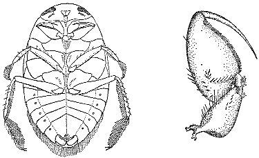 Великолепно плавает и клоп-плавт, но путь его приспособления к жизни в водной среде иной по сравнению с гладышем. Тело плавта уплощенное, сверху оливково-зеленое, снизу серебристое за счет воздушного покрова. Последняя пара ног удлинена, густо покрыта волосками — это мощный плавательный орган. В длину плавт такой же, как и гладыш, в ширину значительно больше (рис. 29). Полезно сравнить особенности плавания плавта с гладышем. Гладыш — хищник открытой воды — плавает в основном прямолинейно, с помощью широко расставленных в стороны задних ног. Ими он делает мощные гребки. Плавт — хищник зоны водной растительности — свободно маневрирует среди стеблей, может описывать крутые виражи, свободно давать задний ход, его гребные ноги взмахивают более часто. Он может действовать ими вместе или попеременно — при крутых поворотах. Плавт, возможно, и не такой быстрый пловец, как гладыш, но более маневренный. В этом смысле его манера плавания ближе к жукам-плавунцам, чем к ближайшему родичу — клопу-гладышу (явление конвергенции). При наблюдениях за плавтом интересно рассмотреть его передние ноги — совершенный хватательный аппарат. Это уже и не ноги, а клещи. Они укорочены, бедро расширено, голень и лопатка сужены. В состоянии покоя узкая часть входит в паз широкого бедра, как лезвие перочинного ножа. Плавт нападает на все, что ему кажется подходящим в качестве добычи по размеру. Плавты — нежелательные гости в рыболовных хозяйствах. Они активно поедают молодь рыб. В аквариуме плавты равного размера при хорошем кормлении живут до года, зимой сохраняют активность. Кормить надо так же, как и гладыша. Правда, мух с поверхности едят менее охотно — это не типичные для них вид добычи и зона охоты. Плавт, однако, легко схватывает корм с поверхности, переворачиваясь на спину. Охотно ест моллюсков, нападает на аквариумных улиток. Самец плавта издает высокие щелкающие звуки, призывая самку и ухаживая за ней. Личинки плавта появляются в природе в середине лета. В аквариумах они успешно живут, линяют и к началу учебного года превращаются во взрослое насекомое. Брать плавта в руки нельзя — укол болезнен, слюна ядовита! Третьим представителем плавающих клопов является группа гребляков — корикса, сигара и др. Размер крупных гребляков — до 16 мм, как и плавта, но уплощенное тело их более вытянуто, чем у него. Сигары значительно меньше. Плавательные ноги — задние. Средние играют роль якоря-захвата, когда насекомое присаживается на глубине для отдыха и питания на растения и грунт. Передние ноги превращены в своеобразные черпачки, их края усажены толстыми жесткими щетинками. Щетинками клоп наскребает водорослевый налет с растений и грунта, собирает его в черепочки и затем всасывает несколько расширенным по сравнению с другими клопами хоботком. Таким образом, все три пары ног гребляков узкоспециализированны (рис. 30). Передними ногами гребляки издают мелодичные звуки, привлекающие самок. Эти звуки трудно услышать с берега водоема, но из аквариума они доносятся отчетливо. Известный натуралист-путешественник А. Фидлер в книге о природе Мадагаскара «Горячее селение Амбинанителло» писал, что тропические гребляки ночью дают столь мощные концерты, что заглушают пение птиц.