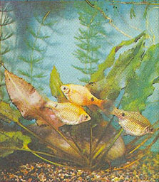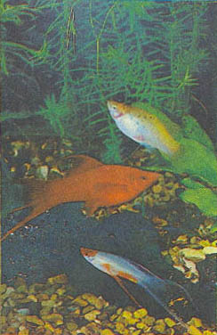 Декоративные рыбы — обычные животные в аквариумах любителей природы. В школьном аквариуме рыбы встречаются в том случае, если школа расположена в городе и приобретает рыб в зоомагазине или у аквариумистов-любителей. В других школах приходится ограничиваться местными видами рыб или обходиться без рыб, заселяя аквариум только беспозвоночными животными. Аквариум, в котором предполагается разместить любых рыб, должен прежде всего удовлетворять тем шести условиям, которые были изложены в начале книги. Но ухаживать за аквариумом для рыб значительно сложнее, чем за аквариумом для беспозвоночных. В аквариуме для рыб особенно важно уравновесить динамику абиотических и биотических условий. На дно аквариума укладывают промытый речной песок. Если размер крупинок 1 мм и менее, песок быстро спрессовывается, корни растений, высаженных в грунт, подгнивают, в грунте со временем накапливаются гниющие органические остатки, возникает избыток органических кислот, скапливаются газы (например, метан). И те и другие влияют на свойства воды, вызывают ухудшение кислородного режима в воде, изменяют качество воды (например, активной реакции воды, окислительно-восстановительного ее потенциала). Крупный гравий размером с зерно фасоли лежит неплотно, корни растений омываются водой, но среди зерен гравия проваливаются остатки корма, обломки листьев и стеблей, они также загнивают и вызывают ухудшение условий существования рыб. Отсюда два вывода: в качестве грунта желателен песок с зернистостью от величины пшенной крупы до гороха; еженедельно необходимо убирать с поверхности грунта остатки кормов, гниющие, побуревшие части растений — таким путем можно замедлить процесс заиливания, старения грунта в аквариуме. В процессе развития модели экосистемы изменениям подвергается и состав растворенных в воде газов, насыщенность ими воды. В новый аквариум заливают обычно водопроводную воду, она находится в трубах под давлением, перенасыщена газами. Помещать в такую воду растения и рыб нельзя. Надо, чтобы вода несколько дней отстоялась. Обычно новый сосуд заполняют на 1/3 водой комнатной температуры (можно смешивать воду из-под крана с водопроводной водой, подогретой до 60 °C), затем засыпают чисто промытый песок (такой способ позволит избежать разницы в температуре песка и воды, что может повлечь трескание стекол аквариума) и доливают воду до уровня на 5 см ниже верхней кромки стенок водоема. Высаживать растения можно через 2–3 суток, когда избыток газов исчезнет; запускать рыб — через неделю. Свежая вода содержит много кислорода, углекислого газа в ней мало. В результате жизнедеятельности растений и рыб соотношение растворенных в воде газов изменяется. Живые организмы насыщают воду углекислотой. Растения достаточно освещены днем, в процессе фотосинтеза усваивают углекислый газ и выделяют кислород. Осенью и зимой нужна комбинированная подсветка аквариума с помощью электроламп; интенсивность последней возрастает в зависимости от естественной освещенности аквариума. Избыток растений нежелателен: ночью они насыщают воду углекислым газом, затрудняя дыхание рыб, днем могут быстро усвоить весь этот газ, а продолжение процесса фотосинтеза путем извлечения углекислого газа из его соединений (например, бикарбонатов) доступно не всем гигрофитам, и голодающ
