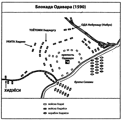 Вы не написали мне, и я в большой тревоге. Становится ли юный принц все больше и больше? Очень важно давать строгие приказы Вашим людям, чтобы Ваше жилище было бы защищено от огня и чтобы между ними и их подчиненными не возникало разлада. К 20-му числу я Вас, конечно, увижу и обниму юного принца, и той ночью Вы будете спать рядом со мной: ждите меня. Повторяю: Вы должны им сказать, чтобы они не позволили юному принцу схватить насморк; Вам не следует быть небрежной в чем бы то ни было (Письмо к Ёдо-гими, 1590 г.)И с ощущением, что он наделен покровительством богов, в апреле 1490 г. он объявил войну семейству Ходзё, не в силах больше выносить их оттяжек и уловок. Хидэёси бросил на чашу весов все свои силы — сухопутную армию и морскую армию, в то время как Ходзё Удзимаса спокойно отступил в соответствии с тактикой, которая всегда приносила ему успех. Он отошел к своему замку Одавара в земле Сагами (современная префектура Канагава), с которым еще не смог справиться ни один противник, ни один из крупных феодалов Севера, даже сам Уэсуги Кэнсин. И сражение назревало медленно, словно каждая из воюющих сторон вдруг застыла в эпической и неподвижной позе: с одной стороны — инертность Удзимаса, с другой — невозмутимое ожидание Хидэёси, поставившего свою армию лагерем (говорили о двухстах тысячах солдат); разве он не умел всегда обеспечить интендантскую службу, которая, впрочем, большую часть времени сводилась к умению прокормить армию на территориях, по которым происходит переход? И что может быть изящней, чем эта административная переписка из палатки, восстанавливающая связь с военными началами исполнительной власти и той походной эффективностью, о какой забыл сёгунат, омещанившись или слишком расслабившись от придворных грез:(Boscaro. Р. 43).