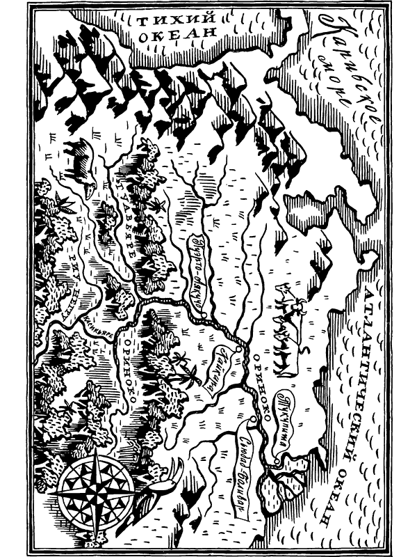 На крайнем севере Южной Америки, в глубине мрачных сырых джунглей, раскинувшихся на склонах гор Серра-Парима, берет начало река Ориноко — одна из самых больших рек континента, третья по водоносности после Амазонки и Ла-Платы — Параны. Огибая с запада и севера широкой водной полосой Гвинейское нагорье, эта река описывает гигантскую дугу и в районе порта Тукупита через множество русел изливает в Атлантический океан огромную массу воды. Имя Ориноко не сходит со страниц учебников географии благодаря одной из удивительных особенностей бассейна — бифуркации (это слово означает по-латыни раздвоение, разветвление). Сформировавшись в большую реку, Ориноко отделяет часть своих вод и дарит старшей сестре — Амазонке. Открытие реки Ориноко началось более четырех веков назад и продолжается вплоть до настоящего времени. Этот долгий период представляет собой целую драматическую эпоху. XV и XVI века ознаменовались важнейшими географическими открытиями, заложившими основу для более правильных представлений о нашей планете. В эти столетия в Европе особенно возвысились Португалия и Испания, ставшие мировыми морскими державами. В гаванях этих стран всегда было оживленно и многолюдно. Отсюда под звон колоколов и грохот салютов отплывали с попутными ветрами гордые красавицы-каравеллы. Они уходили в далекие страны за пряностями, золотом и «черным товаром» — рабами. Сюда же приходили они обратно с потрепанными парусами, разбитыми бортами, поломанными мачтами и реями и сильно поредевшими командами. А часть судов никогда уже более не возвращалась к родным берегам. Среди плеяды знаменитых путешественников и мореплавателей той эпохи особо выдающееся место занимает Христофор Колумб (1451–1506 гг.), прозванный «адмиралом морей и океанов». Сын генуэзского ткача, он испытал все превратности судьбы, то возносившей его до высот человеческой славы, то низвергавшей до положения несчастного узника и бедняка. Во время третьего своего путешествия, в 1498 году, Колумб после длительного плавания достиг берегов Южной Америки. 31 июля матрос, производивший наблюдения с мачты адмиральского корабля, закричал, что видит землю. Это был большой остров. А немного дальше, за проливом, моряки увидели берег другой земли. Колумб и не подозревал, что это Южная Америка и что он совершил величайшее открытие. Он был уверен, что эта земля тоже не что иное, как остров. Все здесь казалось Колумбу удивительным, сказочным. Живописные берега и возвышенности, покрытые роскошной растительностью, пляжи, усыпанные чудесным песком, невиданные растения, птицы, животные. Все, что он видит, находит отражение в названиях, щедро им раздаваемых. Открытую часть южноамериканского материка он называет Землею Гарсия — «Благодатью», залив Пария — «Жемчужным», большой остров, к которому вначале подошли его каравеллы, — «Троицей», южный пролив залива — «Пастью змеи», а северный — «Пастью дракона». В поисках выхода из залива Пария Колумб обнаружил, что в нем, «оказалось, были четыре бухты средней величины, и в одну из них впадала огромная река. Глубина в реке везде была пять локтей, вода пресная, и текла она в огромном количестве». Что же это была за река и откуда она текла? На это Колумб ответить не мог. Он не стал обследовать ее, а решил продолжать путешествие. И все же, восхищенный величественным видом