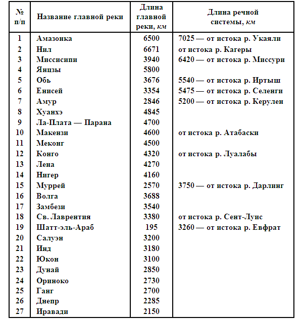 Часто бывает, что в разных источниках (справочниках, энциклопедиях, учебниках и т. д.) длину той или иной реки показывают от места выхода ее из озера или от пункта, где сливаются составляющие ее ветви-истоки. Между тем во многих случаях бывает необходимо знать длину всей речной системы. Это важно для проектировщиков, ирригаторов, специалистов водного хозяйства. Поэтому в таблице для некоторых рек даны две цифры: первая указывает протяжение водотока, вторая — длину всей речной системы. Например, длина реки Шатт-эль-Араб равна 195 километрам; она вычислена от того места, где реки Евфрат и Тигр сливаются вместе, давая начало Шатт-эль-Арабу. Длина же всей речной системы, считая от начала Евфрата, как более длинного истока, равна 3260 километров.