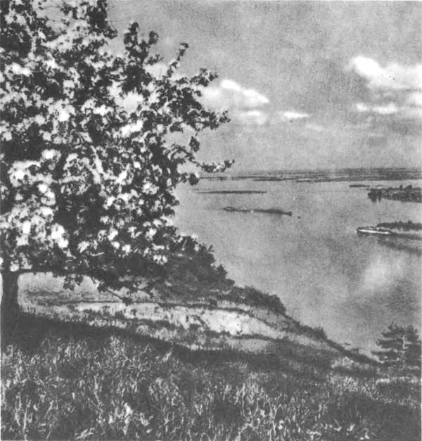 …медленно движутся навстречу берега Волги, — левый, весь облитый солнцем, стелется вдоль до края небес, как пышный, зеленый ковер, а правый взмахнул к небу кручи свои, поросшие лесом, и замер в суровом покое. Между ними величаво простерлась широкогрудая река; бесшумно, торжественно и неторопливо текут ее воды…М. Горький