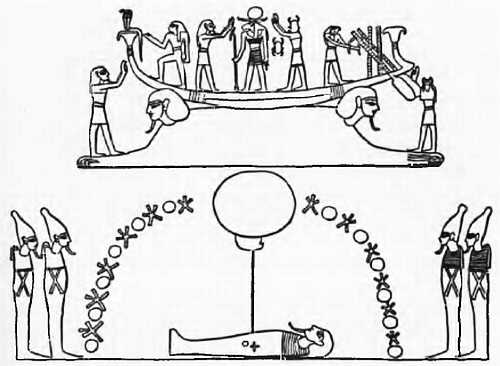 Рис. 1: Свет и потусторонний мир. Сверху: бог земли Акер представленный двумя сфинксами, несущими солнечную лодку с богом солнца Ра в середине. Внизу: мумия под большим солнечным диском.