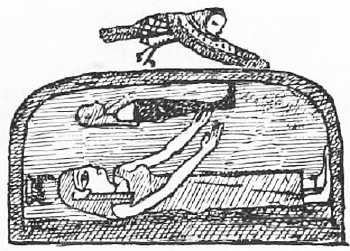 Рис. 7. Брак со смертью. Небесная богиня Нут лежит на дне гроба, раскинув руки к мумии. Над ней висит умерший Ба.