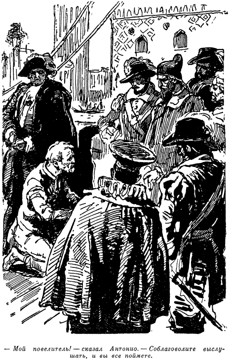 олнце скрылось за вершинами Тирольских Альп, и над низким песчаным берегом Лйдо уже взошла луна. В этот час людские толпы устремились по узким улочкам Венеции к площади Святого Марка — так вода, вырвавшись из тесных каналов, вливается в просторный волнующийся залив. Нарядные кавалеры и степенные горожане; солдаты Далмации и матросы с галер; знатные дамы и простолюдинки; ювелиры Риальто и купцы с Ближнего Востока; евреи, турки и христиане; путешественники и искатели приключений; господа и слуги; судейские и гондольеры — всех безудержно влекло к этому центру всеобщего веселья. Сосредоточенная деловитость на лицах одних и беззаботность других; размеренная поступь и завистливый взгляд; шутки и смех; пение уличной певицы и звуки флейты; кривляние шута и трагически хмурый взгляд импровизатора; нагромождение всяческих нелепостей и вымученная, грустная улыбка арфиста; выкрики продавцов воды, капюшоны монахов, султаны воинов; гул голосов, движение, суматоха — все это в сочетании с древней и причудливой архитектурой площади создавало незабываемую картину, пожалуй самую замечательную во всем христианском мире.