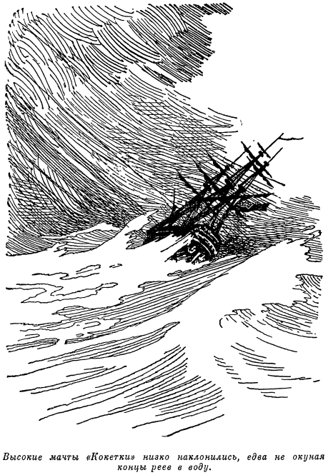 На палубе картина была иная. Немногочисленная прислуга торопилась перезарядить пушки, орудуя прибойниками и банниками со всем напряжением сил, на какое люди способны в трудную минуту. Олдермен никогда не был так поглощен своими счетными книгами, как теперь — обязанностями канонира; юноши, которым пришлось поручить командование батареями, охотно делились с ним своими знаниями и опытом. Трисель стоял у шпиля, хладнокровно отдавая команды и следя за тем, как матросы исправляют повреждения, — он глядел вверх, не замечая ничего вокруг. У Ладлоу сжалось сердце, когда он увидел на палубе кровь — убитый матрос лежал совсем близко, до него можно было дотянуться рукой. В обшивке, куда угодило смертоносное ядро, зияла дыра, палуба были пробита. Решительно сжав губы, капитан «Кокетки» перегнулся через поручни и взглянул на рулевого. Матрос, крепко держа штурвал, стоял выпрямившись, бесстрастный взгляд был направлен на шкаторину переднего паруса так же неуклонно, как стрелка компаса указывает на север. На все это Ладлоу потребовалось не более минуты. Несколько быстрых взглядов — и ему все стало ясно, причем он ни на секунду не терял из виду французский корвет. А тот уже делал поворот оверштаг. Необходимо было немедля произвести ответный маневр. Едва Ладлоу отдал команду, как «Кокетка», словно чуя опасность, быстро увалилась, уходя от вражеского продольного огня [206], а когда французский корвет готов был снова дать бортовой залп, она уже могла ответить ему тем. же. Суда снова сблизились и, выйдя на траверз друг другу, изрыгнули пламя. Ладлоу видел сквозь дым, как тяжелый рей на корвете закачался под ветром и грот-марсель, заполоскав, стал биться о мачту. Спустившись с юта по только что оборванной ядром снасти, он стал на шканцах рядом со штурманом. — Ворочай реи! — сказал он взволнованно, но по-прежнему тихо и ясно. — Вытянуть булинь… привестись, сэр, привестись, круче к ветру! Рулевой откликнулся звонко и уверенно, матросы проворно делали свое дело, и «Кокетка», все еще изрыгая пламя, встала круче к ветру. А еще через минуту огромные клубы дыма, которые заволокли оба судна, соединились и образовали одно белое подвижное облако, которое быстро покатилось по воде, обгоняя ядра, а потом взвилось вверх и грациозно поплыло по ветру. Молодой капитан быстро обошел батареи, сказал матросам несколько ободряющих слов и вернулся на ют. Медлительность французского корвета и меры, принятые Ладлоу, чтобы выиграть ветер, начали сказываться, и крейсер королевы Анны оказался в выгодном положении. Корвет обнаруживал какую-то нерешительность, и она не укрылась от Ладлоу, у которого быстрота, казалось, была в крови. Кавалер Дюмон любил развлекаться на досуге, листая морскую историю своей страны и читая, как Того или другого капитана превозносят за то, что он, сблизившись с врагом, брал паруса на гитовы. Не понимая разницы между судном, действующим в строю, и одиночным противником, он решил тоже не ударить лицом в грязь. В тот самый миг, когда Ладлоу стоял на юте, пристально следя за каждым движением своего крейсера и корвета противника, лишь взглядом или жестом указывая бдительному Триселю, остававшемуся внизу, что нужно сделать, на шканцах французского корвета разгорелся горячий спор между моряком из Булони и беспечным завсегдатаем салонов. Они спорили о целесообр