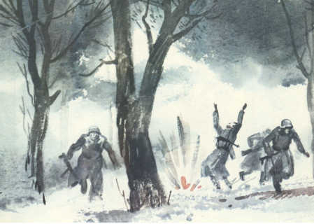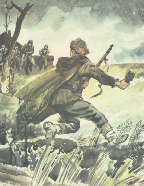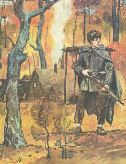 Солнце поднялось над деревьями. Гитлеровцы, развернувшись цепью, медленно двигались к партизанскому лагерю. Лес, пронизанный солнцем, казался таким мирным. А может быть, партизан здесь совсем нет? Может быть, староста ошибся? Цепь остановилась. Офицеры стали совещаться. Один из них, сверяясь с картой, прошёл вперёд по еле заметной тропинке. Вдруг что-то щёлкнуло у него под ногами, раздался взрыв. Мина! Гитлеровцы открыли беспорядочный огонь по зарослям рыжего папоротника, по кустам орешника. Партизаны не отвечали. И фашисты снова осторожно двинулись вперёд. А партизаны совсем рядом. Прижимаясь к земле, они выжидают, чтобы враг подошёл вплотную, чтобы ударить наверняка. Фигуры в серо-зелёных шинелях всё ближе… Партизаны открыли огонь. Гитлеровцы залегли. Началась перестрелка. Теперь партизанам только бы удержаться до темноты. В темноте, в лесу, партизаны вдесятеро сильнее противника!