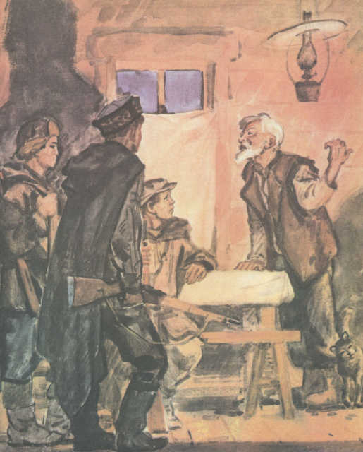 Лебеденко, приоткрыв дверь, прислушался к стрельбе на опушке леса, куда только что ушли Гусейнов и Фёдор. Глухо ударила граната. Дед перекрестился. — Наша? Лебеденко уверенно кивнул: — Гусейнов бросил. Со стороны леса больше не доносилось ни звука. — Только бы парень прошёл. — Должен! Около дома раздался треск мотоцикла, послышалась немецкая речь. — Лезь! — Дед поднял за кольцо крышку погреба. Тут же в дверь забарабанили. Дед не торопясь зашаркал к двери. — Егор! Где ты? Отворяй живо! У входа стоял староста. Рядом с ним — гитлеровский офицер. — Чего горло дерёшь? Не глухой! — ворчал дед. — Не видел, кто сейчас к лесу побег? — Староста светил деду фонарём прямо в лицо. Дед насмешливо улыбался: — Я тебе не нанимался в сторожа! — Ну, Егор, договоришься! — Давно грозишься… Почитай, с гражданской…