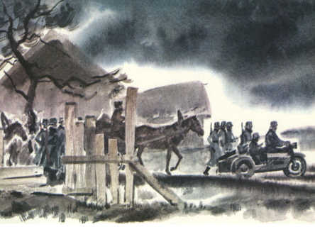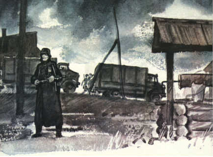 — А теперь срок пришёл! Не видишь, что ли?! — Староста повёл фонарём в сторону площади, уже заполненной грузовиками, мотоциклами. — Господин офицер всё про партизан знает, всё… И где лагерь, и сколько там людей. — Ты доложил? В это время офицер что-то раздражённо сказал, мешая русские и немецкие слова: — Но, шнеллер, быстро, собирай все лошадь, все повозка! — Слышал приказ? Собирай свою команду, и чтобы через пятнадцать минут все повозки были готовы! В лес солдат повезём! — Староста побежал вслед за офицером, но вдруг остановился, оглянулся на деда. — Чего стоишь? Бегом! — Успеешь, — дед не спеша пошёл в дом. — Куда?! — заорал староста. — Куда, куда… Ватник надеть… Не молоденький. А в лесу поди сыро… Дед не прикрыл за собой дверь и долго топтался на пороге, на глазах у старосты напяливал ватник, не попадая в рукава и ворча. А в это время Лебеденко торопливо, шёпотом давал ему указания: — Бери надёжных. Оружие — под сено. Я пойду следом за вами. Действовать будете по моей команде. Понял? Дед пошёл собирать по селу ездовых. В колхозе до войны дед работал старшим конюхом. Ездовыми были такие же, как он, старики. Скоро на площади собрался обоз. Фашистские солдаты грузили в повозки ящики с патронами, мешки со снаряжением. Был четвёртый час утра, когда гитлеровцы вышли из села. Староста поравнялся с повозкой, на которой сидел дед: — То-то же! Служи, Егор, не обделю. Дед на этот раз промолчал.