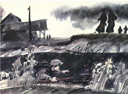 — Давай, дед! Дед Егор поднял руку. Один за другим поднимали руки ездовые, передавая сигнал с повозки на повозку… Фашистский офицер, сидевший в коляске мотоцикла, смеясь, что-то сказал другому офицеру, складывавшему карту. Выбрался из коляски. Прошёлся, чтобы размять ноги. Огляделся по сторонам… И замер. Старики, только что неподвижно сидевшие на козлах повозок, один за другим соскакивали на землю. В руках у каждого — винтовка. Черноволосый парень в кубанке с красной лентой швырнул гранату: — За Родину! И гитлеровцы побежали. Лебеденко кричал: — Вперёд! Огонь! Не дать им опомниться! Старики стреляли по фашистам, и над лесом звенело: — Ура-а! Ура-а! …Партизанский отряд скорым маршем приближался к селу. Фёдор шагал рядом с последней повозкой — на ней везли Гусейнова. Его обнаружили на самой опушке. Пуля ударила в висок. У околицы остановились. Под высокой сосной стали рыть могилу. Кто-то сказал, что хорошо бы дождаться Лебеденко, ведь они с Гусейновым друзья. Но Лебеденко ушёл дальше, к реке, а времени осталось в обрез. Фёдор только теперь понял, что Гусейнова нет. И никогда не будет. И он заплакал в голос, как плачут дети. Потом кто-то подошёл, взял его за плечо: «Пошли, Федя, отряд догонять»…