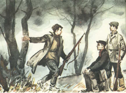 Небо затянуло тучами. Лес уныло шумит под осенним дождём. Трое в накидках гуськом идут по просеке. Под ногами хлюпает, чавкает. Ни зги не видно. Идущий впереди резко останавливается. — Лебеденко! Ты что? — Тихо! Все трое замирают. Впереди, над самой землёй, дрожит пятно света, вот оно медленно ползёт в одну сторону, в другую… — С просеки! — сдавленным голосом командует Лебеденко и тащит обоих за собой. Они едва успевают заскочить за деревья, как вся просека наполняется молочно-белым светом электрического фонаря. Теперь ясно видны и мокрая, обвислая листва, и серые корявые пни, и утоптанная тропинка вдоль просеки.
