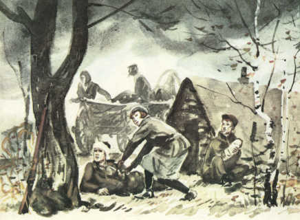 Командир оставался в лагере. Он нарочно оставался здесь, на виду — спокойно сидел на пенёчке, прислушивался к звукам боя. Связные, приходившие в лагерь, раненые, после перевязки возвращающиеся в бой, передавали товарищам: «Командир на месте». И это вселяло уверенность: значит, всё в порядке. Но вот связные стали приносить тревожные вести: патроны на исходе, несколько человек тяжело ранены, а фашисты жмут. Ползут, высматривая огневые точки. Бьют прицельно. Вскоре выстрелы слились в сплошной гул. Над лагерем завыли мины. Командир обернулся к связному: — Передайте медсестре, чтобы повозки с ранеными переставили на другую сторону просеки, за деревья. Поскорее!