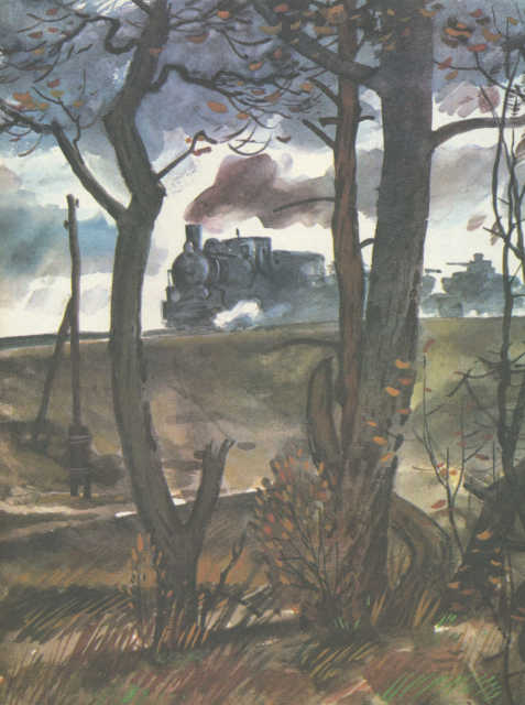 Командир махнул рукой подрывникам — ударил многократный гром. Тяжёлый состав толкает паровоз к пролому. И уже не грохот, а скрежет, визг, вой разрываемого железа стоит над рекой. Из задних вагонов выскакивают гитлеровские солдаты, кричат, беспорядочно стреляют… Партизаны уходят по дну балки, поддерживая раненых. Высокое небо над ними бледно розовеет. Вспыхивает и повисает зелёный огонёк ракеты. За рекой начинается бой за железнодорожную станцию.