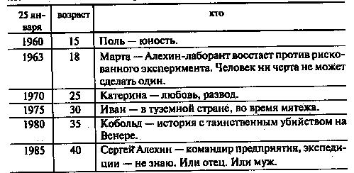 Первая половина 1950-х гг. — [Родился (около 1951 г.) Петр Васильевич, пилот.][37] — [Вышла замуж бабушка Евгения Славина, геодезист.] — Родился Михаил Крутиков. — [Родился Петр Махов.] Вторая половина 1950-х гг. — [Родился Владимир Юрковский (15 ноября 1955 г.).] — Родился Анатолий Ермаков (около 1956 г.). — Родился Алексей Быков ((август?) 1957 г.). — Родился Богдан Спицын[38] — Родился Григорий Дауге (16 сентября 1959 г.). 1960-е гг. — Умер отец Алексея Быкова (1960 г.). — Ядерная энергетика — составная часть в общем энергетическом балансе страны. — Испытания космических ракет на Седьмом полигоне (1961 г.). — Первая в мире высадка на Луну (Николай Тихонович Гер). — Начало полетов на другие планеты (1961 г.). — [Родился Василий Ляхов.] — Родилась Мария Юрковская, сестра В. Юрковского. — Расцвет импульсных атомных ракет, время Краюхина, Привалова, Соколовского. — Николай Краюхин — первый исследователь нескольких лун, строитель пяти крупнейших искусственных спутников (ИС), [победитель в кровавой бойне в Пустой полосе], воспитатель и кумир трех поколений межпланетников; приемный отец А. Ермакова. 1970-е гг. — Одна за другой три экспедиции на Венеру: первый корабль сгорел; вторая сообщила, что идет на посадку и замолчала навсегда; третья благополучно села на поверхность планеты и — через сутки — замолчала.[39] ИНФОРМАЦИЯ: через несколько дней кто-то быстро проговорил в микрофон: «Горячка, горячка, горячка…». На этом связь оборвалась. — Международный конгресс космогаторов (МКК) разработал план изучения Венеры, рассчитанный на пятнадцать лет. — [Знакомство Михаила Крутикова с Н. Краюхиным (около 1971 г.).] — Эл Дженкинс изобрел окситан (1972 г.). — Алексей Быков воспитывается и учится в школе-интернате (до 1972 г.). — Михаил Крутиков окончил математико-механический факультет Университета в Ленинграде. Работа в Институте космогации. Окончание [вместе с Петром Маховым] школы штурманов-межпланетников. (Первая половина 1970-х гг.) — Родилась Вайна Туур, вдова генерал-полковника Туура (1974 г.). — А. Быков — помощник моториста и моторист реактивных глиссеров-амфибий на Волге; участник двух олимпиад в составе хоккейной сборной «Волга» (1972–1976 гг.). — Н. Краюхин — первый исследователь двух больших планет. — М. Крутиков в числе первых участвовал в пробных полетах за пояс астероидов. Знакомство М. Крутикова с Богданом Спицыным (1976 г.). — А. Быков поступил в техническое училище наземного транспорта (бывшая школа автобронетанковых войск), отделение экспедиционного реакторного транспорта (1976 г.). — Гибель немецкого космотанкера вследствие извержения раскаленных газов (протонного фонтана после взрыва) на Солнце (1976 г.). — Шрайбер в Новосибирске развил идею «абсолютного отражателя» (вторая половина 1970-х гг.). — Бидхан Бондепадхай основал на Луне обсерваторию. — Постройка нескольких ИС — обсерваторий для изучения стратосферы Венеры. — Составление карты горных цепей и измерение магнитного поля Венеры. — Французский ИС установил область повышенной радиации на Венере — Урановую Голконду (суммарная площадь — 0,5 млн. кв. км). Информацию подтвердили советские, китайские и японские исследователи. — Высадка и попытка обосноваться на Марсе Нортона. — Экспедиция на Марс Кривицкого (продержался три месяца и нашел на Марсе воду). — Николай Краюхин водил Анатолия Ермакова в первый рейс (конец 1970-х гг.). — Родились Ива