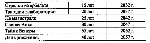 2000–2005 гг. — Постройка на Спу-20 и испытания первого пилотируемого прямоточника «Хиус-Молния». — Публикация «Трудов Академии неклассических механик». — Подписание Пакта о всеобщем разоружении. — Гибель штурмана — испытателя Юсупова. — Штраух выдвинул предложение включать шизоидов в состав экипажей космических кораблей. 2001 г. — Гибель на Юпитере Сергея Петрушевского. — [Александр Лазаревич Семенов — начальник ВШК.] — Сантор Ян — зам. начальника ВШК[42] [ИНФОРМАЦИЯ. Сантор Ян, слывший среди межпланетников под прозвищем «Железный Ян», — великий мастер «прямой космогации» и создатель теории Зоны Абсолютно Свободного Полета.] — Иван Жилин на трехмесячной практике [курсы теории аннигиляционного привода] для выпускников ВШК на Спу-20 («Звездочка»). — Возвращение фотонного танкера-автомата из зоны АСП. ИНФОРМАЦИЯ: из 19 разведчиков 3 не вернулись. — Дипломный перелет И. Жилина Спу-16 Земля — «Цифэй» Луна. — Окончание И. Жилиным инженерного факультета ВШК. — [Председатель ГКМПС Н. Краюхин попросил Школу срочно откомандировать в распоряжение третьего отдела Комитета сменного бортинженера. ИНФОРМАЦИЯ. Третий отдел занимался главным образом грузопассажирской связью с системой исследовательских станций и экспедиций в поясе астероидов и вокруг Юпитера. Трансмарсианские рейсы считались тогда наиболее сложными и молодых межпланетников назначали в такие рейсы только в особых случаях.] — Распределение Жилина на «Тахмасиб». [ИНФОРМАЦИЯ. «Тахмасиб» — новый фотонный рейсовый планетолет типа «Хиус-9». Для планет с атмосферами не годился, тем более, если там были люди; действовал только на трансмарсианских линиях; на марсианских трассах работали старенькие «Хиус»-3 и «Хиус»-4.] — Пек Зенай окончил ВШК, космонавт-испытатель (2001–2009 гг.). [ИНФОРМАЦИЯ. Пек Зенай испытывал самые рискованные модели космических кораблей. Вместе с Иваном Жилиным участвовал в сто шестом рейсе и абордаже на Титане.] — [Написание В. Юрковским и Г. Дауге книги «Планетология и проблемы космогонии».] — Катастрофа с продовольствием (гибель продовольственного склада) на Каллисто. — [Валентин Страут — диспетчер Спу-17; в прошлом — участник штурма Я пета.] — [Карл Рихтер на своем корабле «Лорелея» с грузом отправился в рейс по маршруту Спу-17 Земля — «Цифэй» Луна.] — [Спу-17: погрузка «Тахмасиба» перед рейсом на Амальтею.] — Рейс «Тахмасиба» на Амальтею, спутник Юпитера. Экипаж планетолета: Алексей Быков — командир; Михаил Крутиков — штурман; Владимир Юрковский — планетолог; Григорий Дауге — планетолог; Иван Жилин — бортинженер; Шарль Моллар — радиооптик на Амальтею. [ИНФОРМАЦИЯ. В общей сложности шестой рейс А. Быкова, одного из немногих тогда командиров кораблей на трансмарсианских трассах, на Амальтею.] — Увод Быковым «Тахмасиба» от Юпитера на двенадцатикратной перегрузке. — Прибытие «Тахмасиба» на планетологическую «Джей-станцию» (Амальтея, директор станции — Кангрен). 2002–2005 гг. — Окончание исследований В. Юрковским и Г. Дауге Аморфного Пятна на Уране (март, год неизвестен). [В составе экипажа планетолета «Тахмасиб»: Алексей Быков — командир; Михаил Крутиков — штурман; Владимир Юрковский — планетолог; Григорий Дауге — планетолог; Иван Жилин — бортинженер.] — Возвращение «Тахмасиба» на Землю (сентябрь того же года). — В. Юрковский сорвал банк в казино Города Дураков (5 де