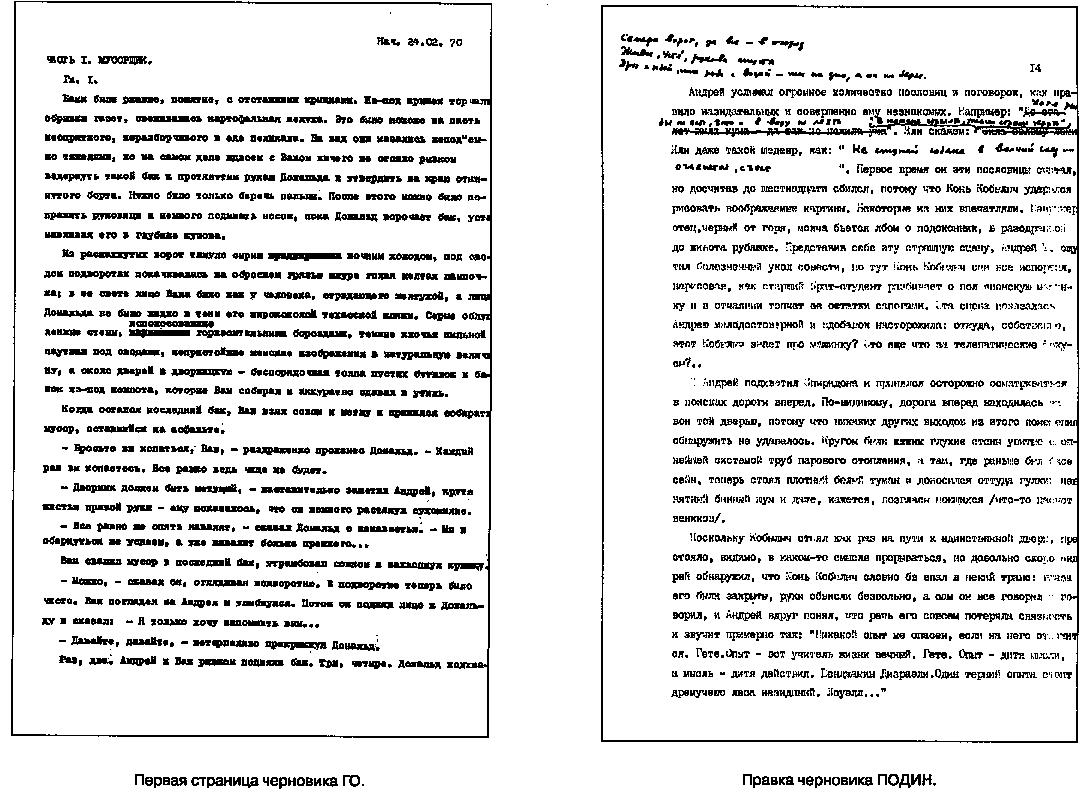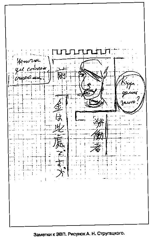 О работе над ВГВ БНС в «Комментариях» пишет: «В истории написания этой повести нет ничего особенного и тем более сенсационного. Начали черновик 27.03.83 в Москве, закончили чистовик 27.05.84, в Москве же. Все это время вдохновляющей и возбуждающей творческий аппетит являлась для нас установка написать по возможности документальную повесть, в идеале — состоящую из одних только документов, в крайнем случае — из «документированных» размышлений и происшествий. Это была новая для нас форма, и работать с ней было интересно, как и со всякой новинкой. Мы с наслаждением придумывали «шапки» для рапорт-докладов и сами эти рапорт-доклады с их изобилием нарочито сухих казенных словообразований и тщательно продуманных цифр; многочисленные имена свидетелей, аналитиков и участников событий сочиняла для нас особая программка, специально составленная на мощном калькуляторе «Хьюлетт-Паккард» (компьютера тогда у нас еще не было); а первый вариант «Инструкции по проведению фукамизации новорожденного» вполне профессионально набросал для нас друг АНа — врач Юрий Иосифович Черняков…» Но, как выясняется из архивных материалов, идея сделать повесть состоящей из отчетов, рапортов-докладов, записей бесед и реконструкций событий, написанных Каммерером, возникла у Авторов несколько позже — когда уже были написаны несколько вариантов текста, частично сохранившихся в архиве. Поначалу изложение ВГВ было обычным — повествовательным. По тому, что наличествующие страницы и главы, встречаемые в тексте, имеют нумерацию, а также по тому, что страницы, начинающие или завершающие сохранившиеся отрывки, зачастую обрезаны сверху или, соответственно, снизу, можно сделать вывод, что отдельные страницы этих вариантов были использованы для окончательной версии повести. Поначалу АБС, вероятно, кроме общей концепции повести придумали значимые для них высказывания, реплики, споры и обсуждения, а затем уже вкладывали их в уста того или иного персонажа или переносили этого персонажа в другую обстановку, чтобы он произносил их другим собеседникам. Это можно увидеть в сохранившихся отрывках как минимум двух ранних черновиков. Первый вариант. С. 29–38: <…> энергетика — вот что самое странное. Тора внимательно посмотрел на меня своими ореховыми главами. — Не выспался? — Да нет, ничего, я там подремал немножко на солнышке… — Хорошо, — произнес Тора и побарабанил пальцами по столу. — Давай-ка пока отвлечемся от технологии, это не наше с тобой дело. Согласен? Я уже довольно давно перестал понимать, что теперь наше дело, а что не наше. Это меня уже больше даже не раздражало. Я привык. Иногда мне даже казалось, что и сам Тора не очень хорошо представляет себе, где кончается наше дело и начинается не наше. Поэтому я с легким сердцем и чистой совестью сказал, что ему, Торе, виднее. — Да, мне виднее, — сказал он легко. — А поэтому скажи мне, пожалуйста, Тойво, дружище: что тебе показалось самым странным, если отвлечься от технологии? — Дисперсия реакции, — сейчас же сказал я то, что сформулировал для себя еще там, в Малой Пеше. Губы Торо вытянулись дудкой, и я понял, что он сейчас съязвит, и поспешно добавил: — Я имею в виду, что это только на первый взгляд была повальная паника. Так это выглядело только потому, что паникеры нашумели больше всех. Задали тон. А на самом деле, смотрите. — Я стал заги