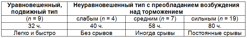 Сильный неуравновешенный тип — сильная возбудимость при слабом процессе торможения, а в целом — высокая работоспособность. У собак быстро отрабатываются основанные на возбуждении УР и оченьмедленно и непрочно — тормозные УР (дифференцировка, условный тормоз, выдержка), которые к тому же часто растормаживаются. Сильный уравновешенный подвижный тип — в равной степени сильные возбуждение и торможение, которые при необходимости легко сменяют друг друга; в целом — высокая работоспособность. У собак быстро и прочно вырабатываются любые УР, в том числе запаздывающие, легко переделывается стереотип. Сильный уравновешенный малоподвижный (инертный) тип — в равной степени сильны возбуждение и торможение, но эти процессы с трудом сменяют друг друга; в целом — высокая работоспособность. У собак быстро и прочно вырабатываются любые УР, но они медленно перестраиваются при изменении раздражений, в частности, с трудом переделывается стереотип. Слабый тип — слабо развиты возбуждение и торможение, поэтому трудно судить об их уравновешенности и подвижности; в целом — низкая работоспособность. У собак с трудом вырабатываются любые УР, при сильных и резко сменяемых раздражениях они быстро впадают в запредельное торможение, склонны к истерии, легко подвержены неврозам. Перечисленные типы ВНД непосредственно определяют темпераменты и служат их нервной основой: холерический, сангвинический, флегматический и меланхолический соответственно. Их следует воспринимать как исходные ориентиры, как системы отсчета в связи с возможностью разнообразных вариаций, что обусловливает соответствующие им разнообразные формы поведения. Такая потенциальная изменчивость проявления типов ВНД у животных обусловлена постоянно меняющимися реальными условиями. Так, собака, проявившая сильный тип ВНД в одних условиях, может проявить в других условиях какие-то черты слабого типа и наоборот. Тогда в первом случае говорят о сильном типе слабой вариации, а во втором — о слабом типе сильной вариации. То же может происходить и с подвижностью нервных процессов (Л. В. Крушинский, 1991). Недаром И. П. Павлов, выявляя тип ВНД у животных, в том числе у собак, помещал их в специально сооруженную толстостенную «башню молчания», изолирующую их от внешних воздействий. Возбуждение может преобладать над торможением или наоборот в разной степени. Следовательно, в реальной жизни должно существовать большое разнообразие типов ВНД. Так, И. П. Павлов считал, что на основе трех свойств возбуждения и торможения (силы, уравновешенности и подвижности) теоретически возможно формирование 96 вариаций типов ВНД [16]. В действительности в зависимости от методов исследования, состояния животного и других факторов их может оказаться больше или меньше. В группах сходных пород, животные в которых обладают специфическим и близким темпераментом, могут встречаться одни типы ВНД и не встречаться другие, а имеющиеся типы могут проявляться в различных вариациях, т. е. в виде подтипов. О. В. Перепелкина (1996) сравнивала 46 рабочих собак легавых пород — островных (выведены на Британских островах) и континентальных (выведены в Германии). Считается, что первые значительно темпераментнее вторых. И действительно, почти все островные собаки (ирландский и английский сеттеры) были отнесены к неуравновешенном