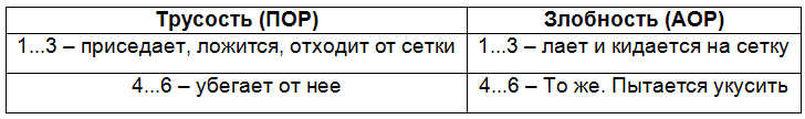 Оригинально представили ПРП охранных собак К. Ф. Дьюет и Д. Дьюет (1997): в сочетании с другими признаками поведения в виде контакта взглядом, т. е. насколько часто и упорно смотрят в глаза противнику. К сожалению, нечетко представлены типы ВНД и темпераменты. Например, в шкале темпераментов половина «уравновешенных собак» показана как сангвиники, а другая половина — с защитно-оборонительным инстинктом (а кто они по темпераменту?). Так вот, сангвиников разделили на три группы по уровню мотивации: без нее (единственная мотивация — себялюбие, ленивы), средняя (социальны, любопытны, но одна и та же игра быстро надоедает) и хорошая (сверхсоциальны, жизнерадостны и постоянно в игре). Контакт взглядом составил 25, 30…40 и 50 % соответственно. Собак с защитно-оборонительным инстинктом также разделили на три группы: слабый (социальны, но насторожены, веселы и сторонятся людей, часто демонстрируют голосовую агрессию, но при натиске теряют уверенность и отступают), нормальный (доминантны, но охотно подчиняются хэндлеру, не слишком агрессивны, но при угрозе и по команде нападают) и сильный (очень доминантны, но подчиняются хэндлеру с твердым характером, очень недоверчивы, не допускают незнакомых людей). Контакт взглядом (смотрят прямо в глаза) по группам составил 60…70 %, 70…80 и 80…90 %. Представлены крайние варианты. Неподдающиеся дрессировке — альфы: антисоциальны, внешность угрожающая, очень агрессивны, кусают собственного владельца, глаза застывшие, холодные, смотрят прямо в глаза, контакт взглядом 90…100 %. Меланхолики: при всей своей злобности в сочетании с боязнью и нападением исподтишка почти не смотрят в глаза.Типы высшей нервной деятельности и преобладающая реакция поведения взаимосвязаны, поскольку обусловлены одними и теми же процессами возбуждения и торможения, особенно при сопоставлении сильного и слабого типов с АОР и ПОР, в обиходе обозначаемых как смелость и трусость. Принято считать, что АОР соответствует сильному типу ВНД, а ПОР — слабому. Для проверки этого, казалось бы, естественного предположения Л. В. Крушинский (1991) определял тип ВНД у собак одного питомника, не проявлявших и проявлявших ПОР (табл. 6).