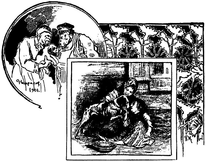 Голодная Фрося все сидела на крыльце и закрыла глаза, готовые подернуться слезами. Вдруг детский крик, раздавшийся над ее головой, склонившейся в унынии, заставил ее вздрогнуть и раскрыть глаза. Перед нею стояли Катя и Анюта Гобзины. Девочки были погодки, обе белокурые, обе розовые, курносые, с широкими скуластыми рожицами, покрытыми веснушками; они были, очевидно, обеспокоены. В маленьких загорелых и пухлых руках старшей, Кати, торчала деревянная посудина, выкрашенная снаружи. В ней лежали кости, жирные обрезки мяса и куски хлеба. Девочка, с трудом держа тяжелую для ее ручонок чашку, полуоткинулась назад своим коротеньким телом, в светлом платьице, таком же как и у Анюты. — Девочка, девочка! — восклицала она, обращаясь к Фросе: — не видала ты Пестрянки, нашей собачки? Она сбежала… Цепь порвалась, и она убежала… А мы ей корму принесли. — Да, убежая… не видая? — вторила ей, лепеча, совсем как маленький ребенок, Анюта. Круглые, светлые глазки ее под золотистыми, чуть видными бровками расширились и округлились; точно перетянутые ниточками, пухлые кисти рук в детском отчаянии хлопали по юбке. Фрося в первый раз видела так близко перед собою этих девочек, этих счастливиц, дочек самого Сидора Петровича. Она даже смутилась от этой встречи; но известие, что Пестрянка убежала, взволновало ее не менее хозяек несчастной собаки, пришедших, по случаю отъезда отца, покормить свою любимицу. И едва эта мысль — Пестрянка убежала — вспыхнула искоркой в головке и без того расстроенной Фроси, как рядом с ней вспыхнула и другая, еще более ужасная. И она, позабыв всякое смущение, вскочила со ступеньки крыльца и, хлопнув по бедрам своими худыми руками почти так же, как это делала Анюта, воскликнула: — Убежала!? Пестрянка!? Наверно, в лес! А там волки!.. Ох, съедят ее!.. Еще вчера Никандра мамыньке говорил: страшенные волки! — Волки! — вдруг взвизгнула Катя и поставила на землю посудину с кормом: точно у нее ручонки обессилели от того, что сказала Фрося. Анюта же вдруг разом заплакала громко и протяжно. — Анютка! Анютка! не плачь! — закричала на нее Катя и даже затопала босой ножкой. Но в окрике старшей сестры слышались почти такие же слезы, как и в плаче младшей. Анюта не унималась. — Во-олки! во-олки! — выкрикивала она сквозь слезы… — Ну, пойдем к маме, к маме пойдем! — схватила ее за руки Катя. — Скажем ей, скажем ей… И, не договорив, что они скажут маме, обе девочки, одна, все еще всхлипывая на бегу, другая, тяжело дыша, побежали, держась за руки, в ворота своего двора и скрылись за ними. Только их босые белые пятки сверкнули перед Фросей. Она осталась опять одна. У ног ее на зеленой травке, перед крыльцом школы стояла посудина с кормом, которую девочки от волнения забыли. Из посудины пахло недавно сваренным мясом; сочный жир желтоватым теплым блеском отсвечивал на солнце; аппетитные, хотя и обгрызенные куски сероватого ситного хлеба с светло-коричневыми корками, обсыпанными кое-где мукою, выставлялись из краев посудины. Во время короткого разговора о Пестрянке Фрося забыла о своем голоде; но вдруг запах и вид всего этого точно пробудил внутри ее какое-то злое, маленькое животное, которое заскреблось в ее груди, завозилось в ее желудке… Ее больная худая рука быстро протянулась к посудине. Но она сейчас же отдернула руку. Разве это для нее? Ведь, это для Пестрянки… Но, ведь, о