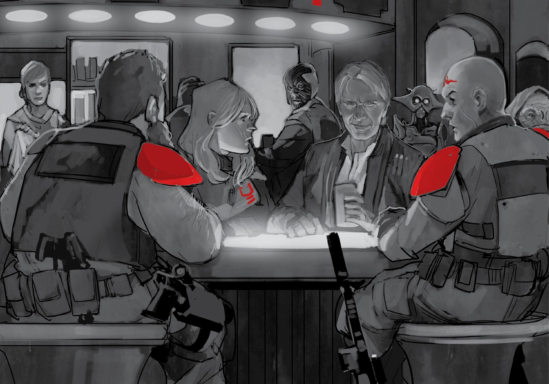 Соло не стал оборачиваться: он и так знал, что она сейчас сделает. За прошедшие тридцать с лишним лет «Горе не беда» могла сменить одно-два имени, а то и с полдюжины — честно говоря, кореллианин сбился со счета. И если кое-где глаз замечал что-то новое — другую официантку вместо сломавшейся дроидессы, свежий слой краски, — то в остальном все осталось прежним. Спиртное все так же продавалось по завышенной цене, но его не разбавляли и наливали до краев. Куртис все так же охранял парадную дверь, если таковой можно было назвать вход в трюм.